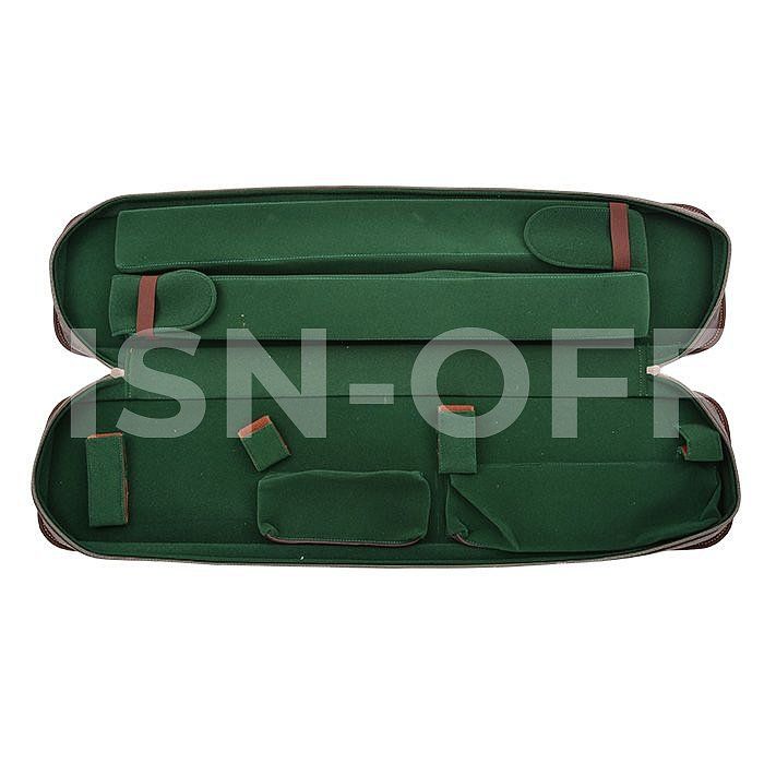 Изготовлен в традиционной форме из специальной ткани и натуральной кожи. Предназначен для хранения и транспортировки оружия в разобранном виде с двумя сменными стволами. Объёмные чехлы для ружей выполнены из натуральной кожи и прочной износостойкой синтетической ткани, которая не промокает, не истирается и легко очищается от загрязнения.