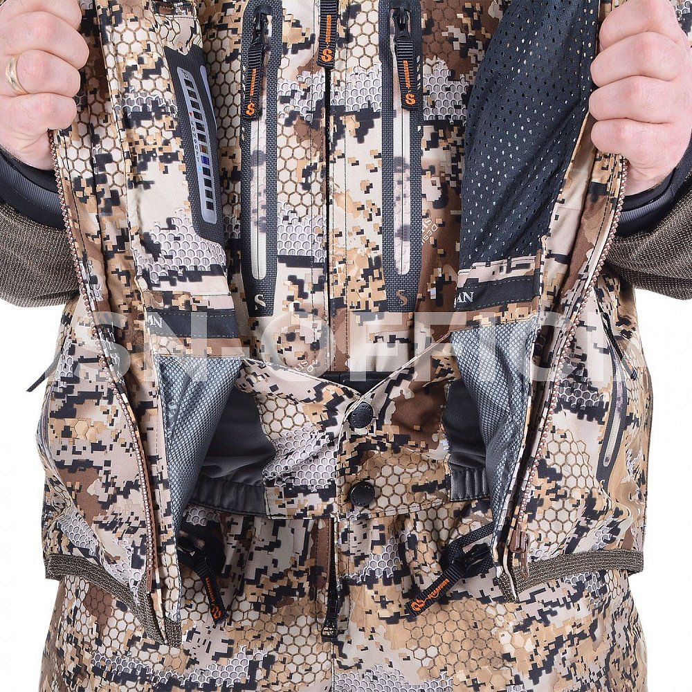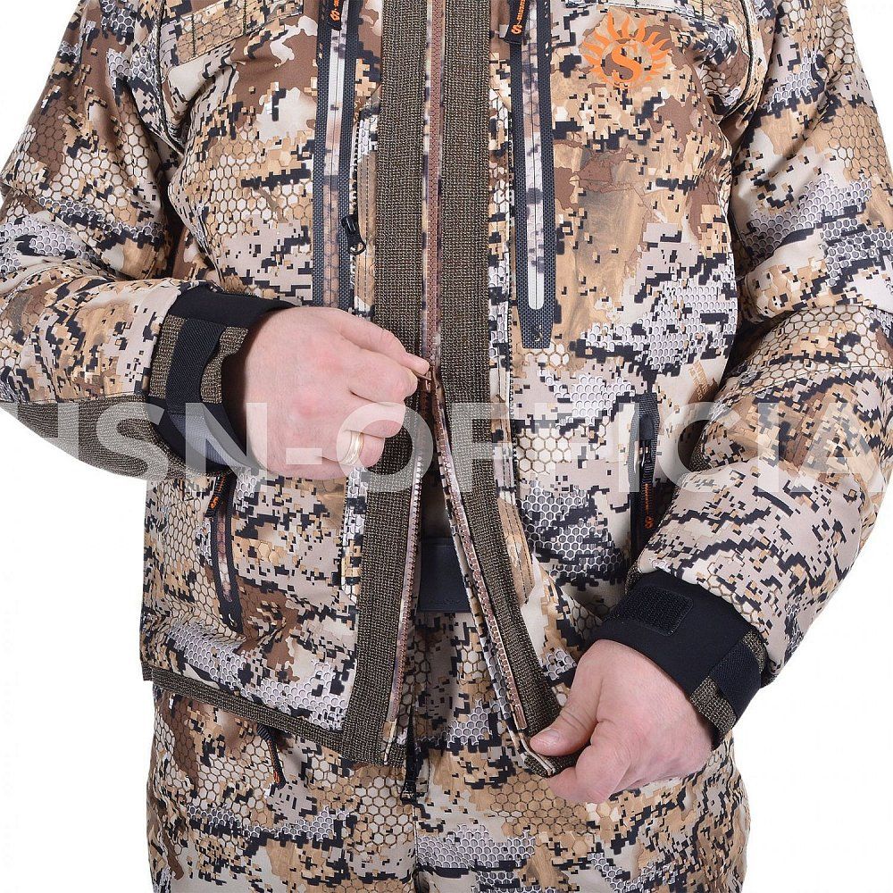 Зональный метод утепления костюма — дополнительный слой утеплителя Альполюкс (Alpolux®) в зоне груди, спины куртки, а также в зоне седалища и бедер в полукомбинезоне.